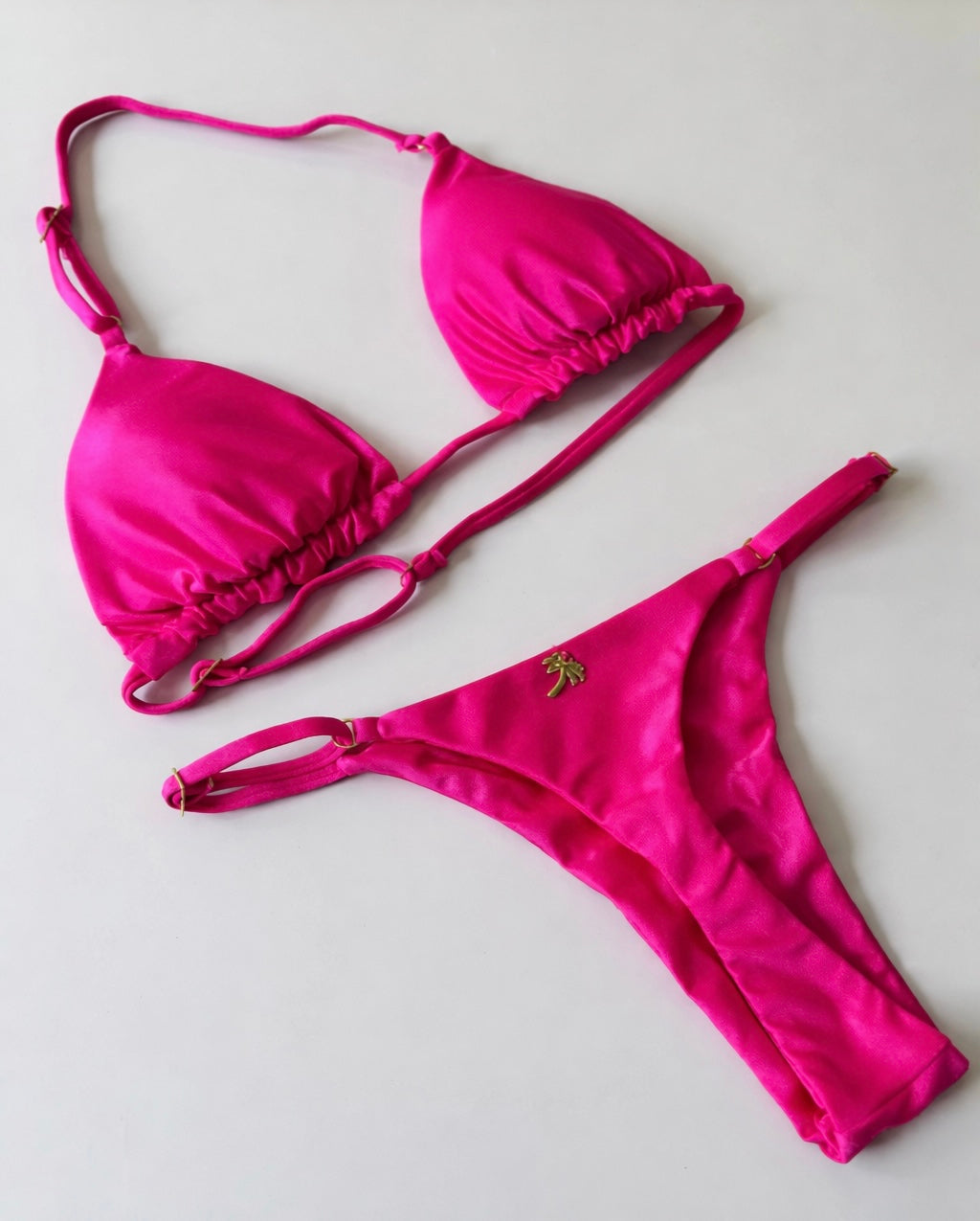 Intenso, luminoso e irresistível. Este biquíni em rosa vibrante foi criado para realçar a tua pele e elevar o teu bronze a outro nível. Com efeito beach gloss, o tecido reflete a luz de forma subtil, proporcionando um brilho sofisticado e um visual marcante à beira-mar.